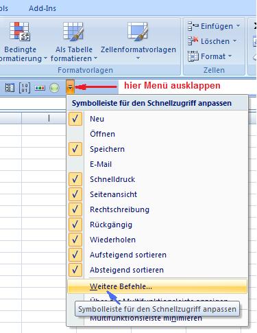 Öffnen Sie das Menü "Symbolleiste für den Schnellzugriff anpassen". (Pfeil am