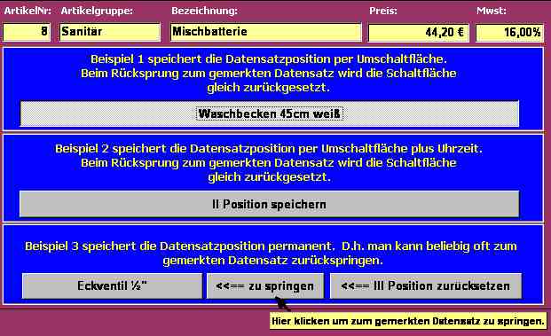 3 Beispiele um sich die Position eines Datensatzes zu merken um später diesen gezielt anzuspringen. (für Access 2000 und XP) Der VBA Code kann einfach in Ihre Anwendung kopiert und angepasst werden.