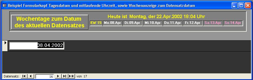 Ein Beispiel zur Formulargestaltung. Timergesteuerte Uhrzeit und Tagesdatum immer im Blick direkt im Formularkopf Oder die passende Kalenderwoche zum Datum des jeweiligen Datensatzes (für Access 2000 und XP) Die Elemente und der VBA Code können einfach in Ihre Anwendung kopiert und angepasst werden.